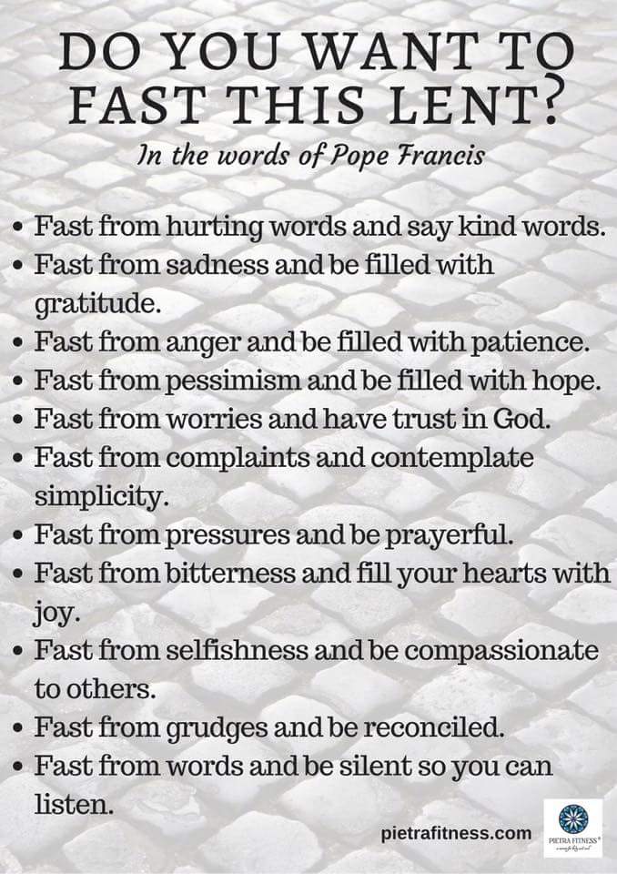 This image that has been circulating on Facebook has given me a different way to view Lent. Last year, I gave up chocolate (an enormous sacrifice!) and desserts. This year, I’m going to re-read the words of Pope Francis, and consider my words and attitudes. But I want to do more than giving up, or fasting from things. This year I am going to study and meditate on the book of Luke. I’m going to look at the life of Christ and ask him to help me to live and love like Him. I aspire to give of my time and talents. This month I’m hoping to knit five hats for the homeless as a way to help those less fortunate.