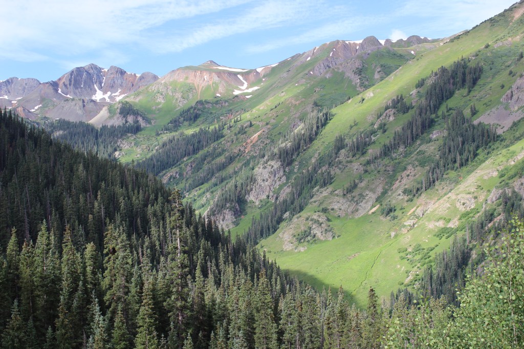 My eye travels down just below the lofty peak to a long expanse of grassy tundra still dotted with snow in its ravines. Farther down, a pine-covered peak reaches for the morning sun. Still lower, and much closer to the amphitheater, a long, pine-covered green ridge displays a smattering of the rusty brown color caused by voracious pine beetles destroying the tall trees.