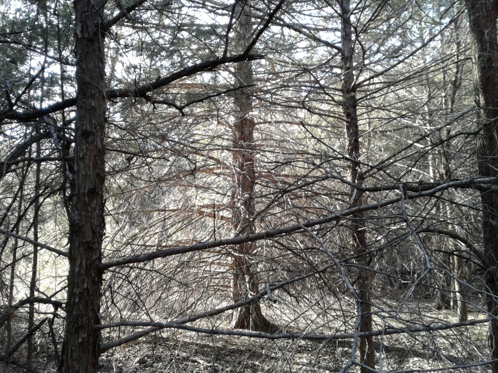 Pushing aside branches, I walked fifteen feet, entering a small clearing. The ground, carpeted with years of accumulated needles, felt soft beneath my feet. A chorus of crickets broke the silence. In the distance a woodpecker drilled, searching for insects. Inside my clearing, all was shadow, quiet and still; it became a sanctuary that soothed my soul. A smattering of bright red sumac leaves provided stained-glass windows. I sat on the carpet of spruce needles, gazing at the beauty all around me, and I felt the presence of God. Strains of “This Is Holy Ground” ran through my head.