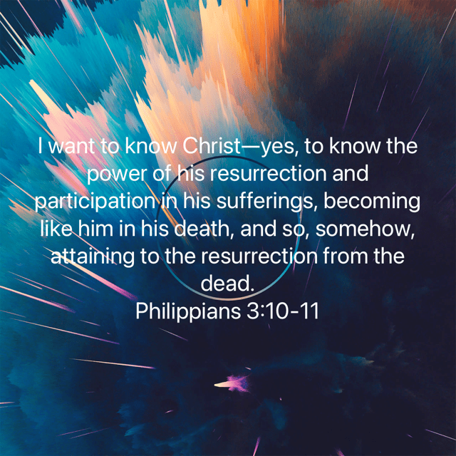 Wow, this is such a powerful verse. To know even a little of the power of Jesus’ resurrection would be such a privilege. Open my eyes and my spirit Lord, that I might have a better understanding of Your power and might. Let me know you and worship you.